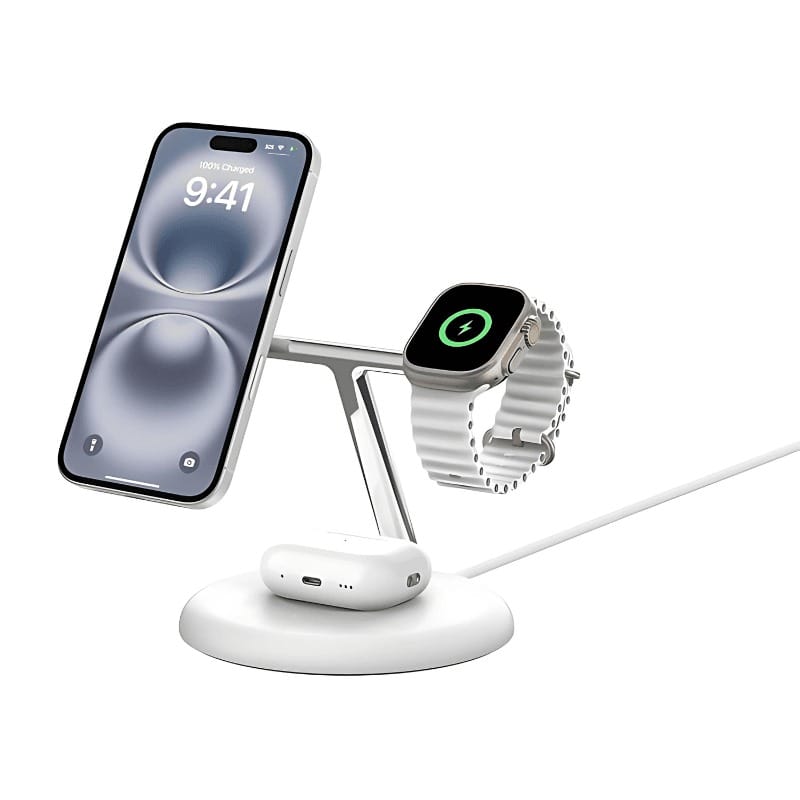 La station de recharge 3-en-1 BELKIN Qi2 (15W) est la solution idéale pour les utilisateurs Apple à la recherche d’efficacité et de compacité. Conçue pour recharger simultanément un iPhone MagSafe, une Apple Watch (Series 7 à Ultra 2) et des AirPods avec boîtier sans fil, elle intègre la technologie Qi2 pour une recharge rapide et sécurisée. L’iPhone reste parfaitement aligné grâce à l’aimant puissant, même en mode StandBy, tandis que l’Apple Watch peut atteindre 80 % de charge en seulement 45 minutes. Son design pliable et portable, ses matériaux premium (revêtement soft-touch, base antidérapante) et sa compatibilité avec les coques jusqu’à 3 mm en font un compagnon de voyage idéal. Cette station est fournie avec un adaptateur secteur 36 W et un câble USB-C intégré, le tout dans un emballage écoresponsable sans plastique. Un choix haut de gamme pour une recharge simple, rapide et élégante.